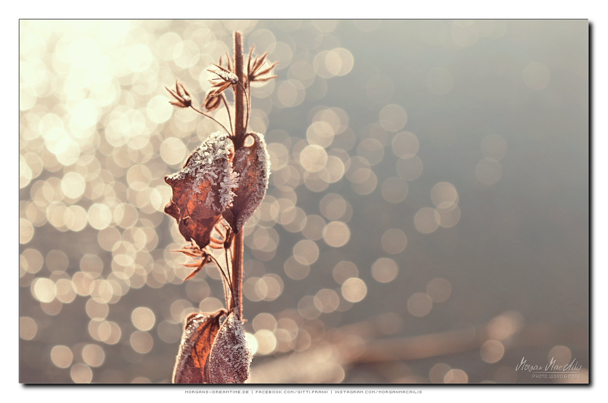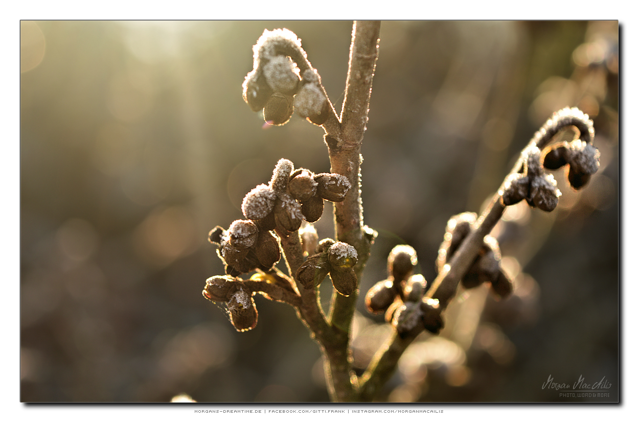 Die Natur ist in den Winterschlaf gefallen, die Sonne hat an Kraft verloren. Vom farbenfrohen Spätherbst nur noch ein paar vereinzelte Überreste zu sehen, die sich krampfhaft versuchen gegen das triste Grau-in-Grau der kalten Jahreszeit zu behaupten. Aber auch jetzt gibt es vieles, was es wert ist, Beachtung zu erhalten. Meist wird der Mensch aber gehetzt und dick eingepackt von einem Termin zum nächsten Eilen und keine Zeit für die vielen kleinen Lichtblicke finden. Wollsocken, eine dampfende Tasse Tee vor sich, ruhige Musik und Kerzenschein - die gemütliche Seite des Winters.