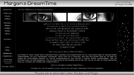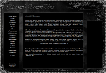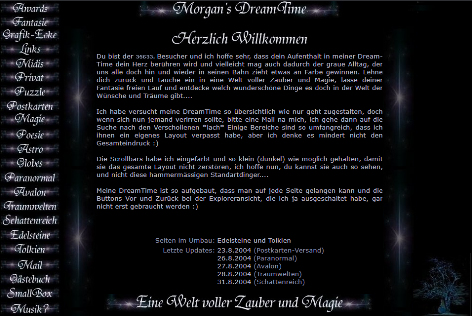 Ende 2001 fing ich dann an eine eigene Fantasiewelt zu erschaffen, mein Schattenreich. Auch nicht wirklich prall zum Anfang, aber damals fand ich es schick. Und da es noch nicht in meiner DreamTime integriert war, spielte das Layout auch noch keine so große Rolle für mich. Da mir mein kleines Reich noch zu klein vorkam, beschloss ich die Bereiche Tolkien und Magie aufzunehmen. Und selbstverständlich mein Schatzi (inzwischen Ex-Mann) nicht zu vergessen, ihm widmete ich auch etwas Platz. Das Layout verfeinerte ich weiterhin, was aber immer mühseliger wurde, um so umfangreicher meine HP wurde.